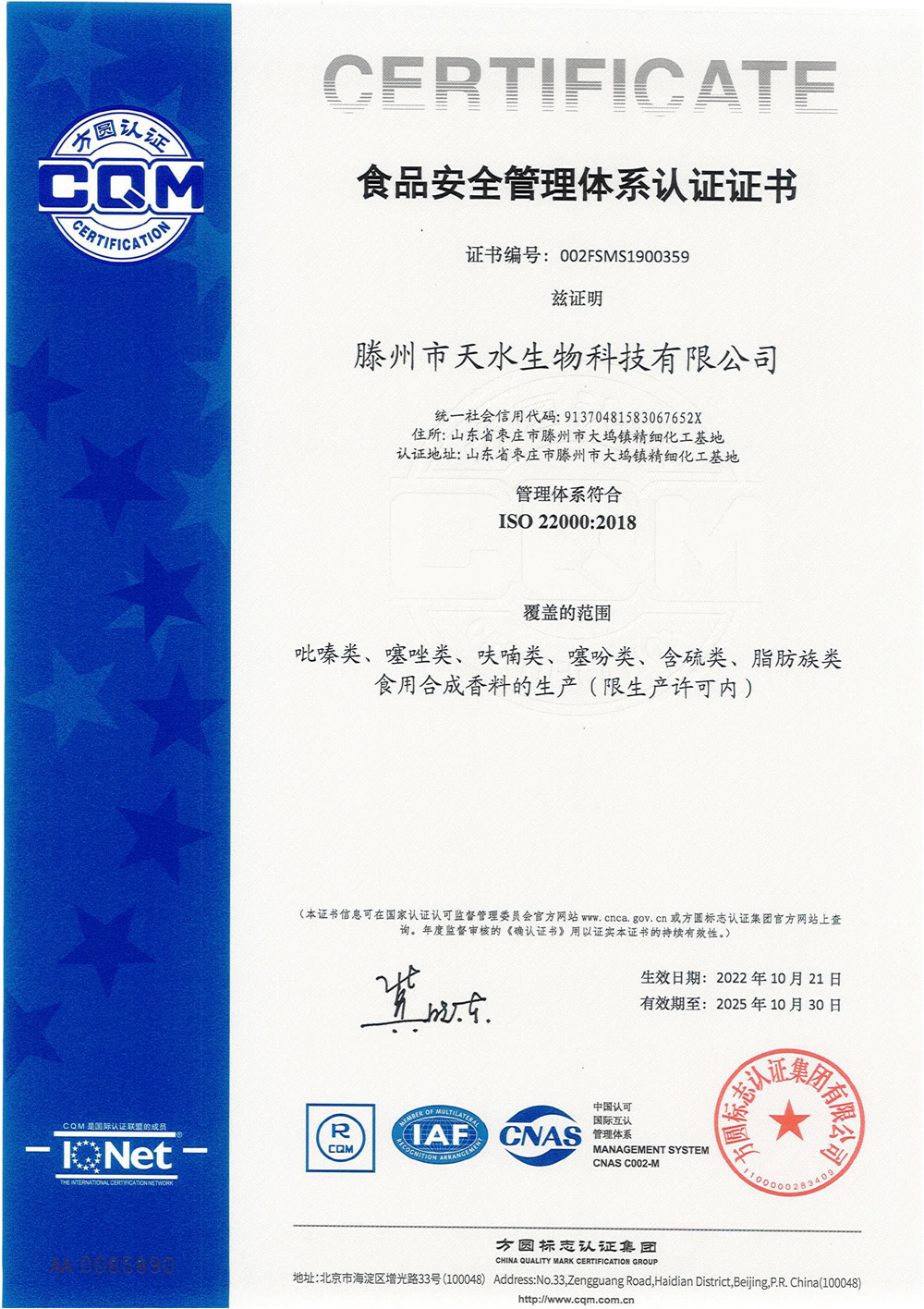 滕州市天水生物科技有限公司成立于2011年9月,是目前國內雜環類合成食品香料、日化香料和醫藥中間體生產經營的綜合性企業。坐落于山東省滕州市生物醫藥產業基地,總投資5000余萬元,占地面積約30000平方米,員工百余人。公司先后被評為高新技術企業、專精特新中小企業、科技型中小企業,建有市級重點實驗室1處,并先后獲得ISO9001質量體系認證、ISO22000食品安全體系認證、kosher認證和Halal認證。是香精香料及食品配料協會會員單位及滕州市中小企業協會理事單位。